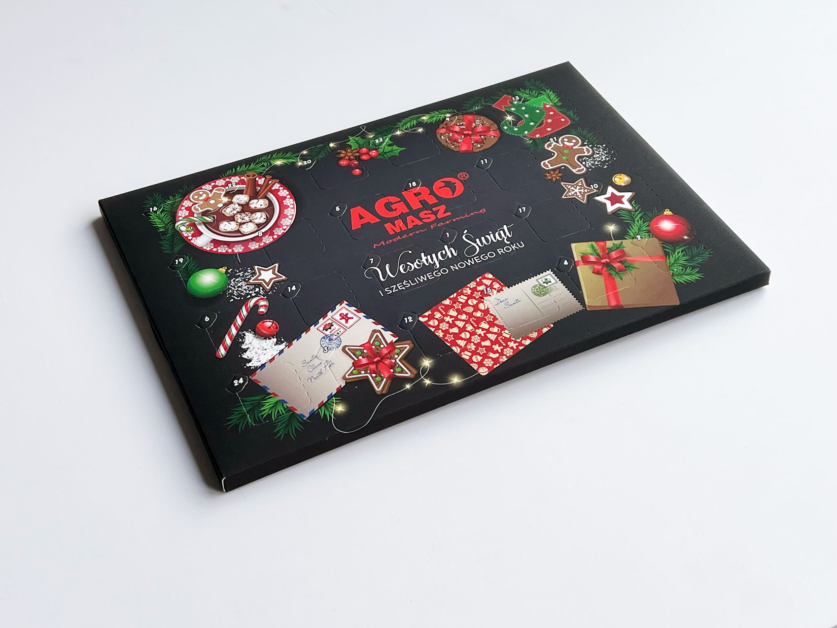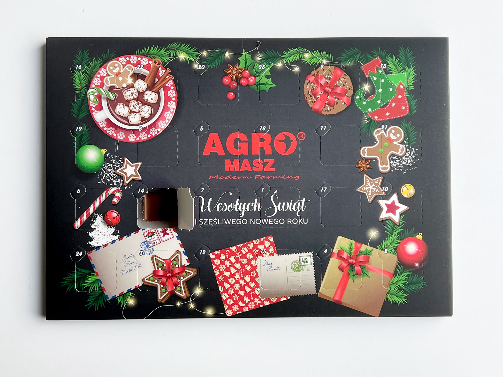 Kalendarz z 24 czekoladkami ozdobionymi świątecznymi wzorami. W wersji podstawowej wykonany jest z czekolady mlecznej, natomiast na życzenie dostępne są także warianty z czekolady białej lub deserowej.