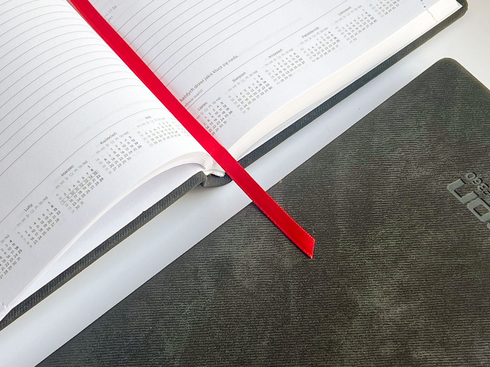 Kalendarz ze znakowaniem na ślepo, ale możesz wybrać również inną formę znakowania: tłoczenie kolorową folią, nadruk UV oraz nadruk sitodrukowy.